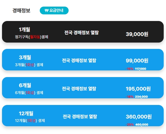 이용요금은 1개월 정기구독(월자동) 결제시 39,000원, 3개월(1회성) 결제시 99,000원, 6개월(1회성) 결제시 195,000원, 12개월(1회성) 결제시 360,000원입니다. 제공하는 서비스는 전국 경매정보 열람입니다.