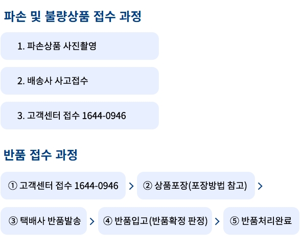파손 및 불량상품 접수 절차는 파손상품 사진촬영 > 배송사 사고접수 > 고객센터(1644-0946) 접수 순입니다.