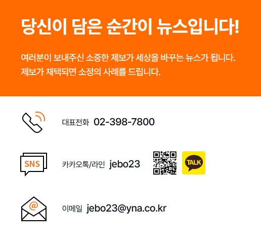 여러분이 보내주신 소중한 제보가 세상을 바꾸는 뉴스가 된다고 하는데요, 제보가 채택되면 소정의 사례를 드립니다. 온라인 제보 이외에도 대표전화 02-398-7800번, 카카오톡/라인 jebo23, 이메일 jebo23@yna.co.kr을 통한 제보도 가능하니 원하는 채널을 이용해 보세요.