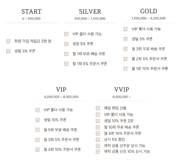 - VIP(400~800만원) : VIP폴더 사용가능, 생일 10% 쿠폰, 월 5회 무료배송 쿠폰, 월 3회 5% 주문서 쿠폰, 월 2회 10% 주문서 쿠폰