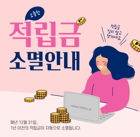 적립금의 경우 매년 12월 31일에 1년 이전의 적립금이 자동으로 소멸됩니다. 예를 들어서 2025년 12월 31일 적립금 자동 소멸 시행 시, 2024년 12월 31일까지 적립된 적립금이 소멸 대상입니다. 적립금 소멸 시 재적립이 불가하니, 꼭 기간내에 사용하시기 바랍니다.