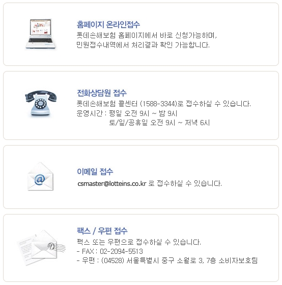 롯데손해보험 홈페이지(let | 롯데손해보험 | 당연한것을 당연하도록 | 렛)에서 바로 신청 가능하며, 민원접수내역에서 처리결과 확인이 가능합니다.