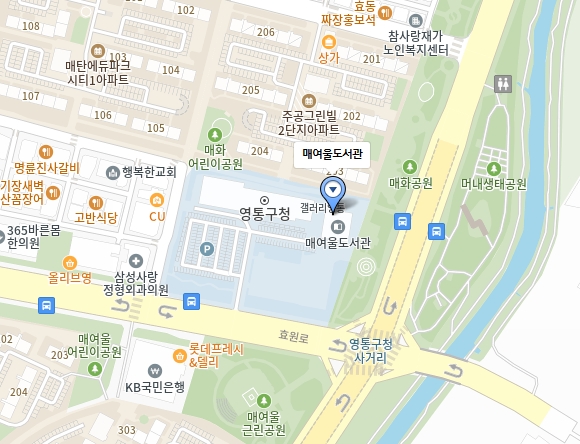 매여울 도서관 주소는 (16545)경기도 수원시 영통구 효원로 415(매탄동)이고, 주차는 영통구청 주차장을 이용하시면 됩니다. 도서관 방문시 1시간까지 무료주차가 가능합니다.