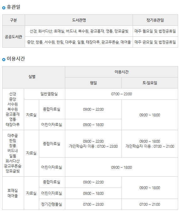 선경, 화서다산, 호매실, 버드내, 북수원, 광교홍재, 영통, 망포글빛 도서관은 매주 월요일 및 법정공휴일 휴무입니다. 중앙, 창룡, 서수원, 한림, 대추골, 일월, 태장마루, 광교푸른숲, 매여울 도서관은 매주 금요일 및 법정공휴일 휴무입니다.