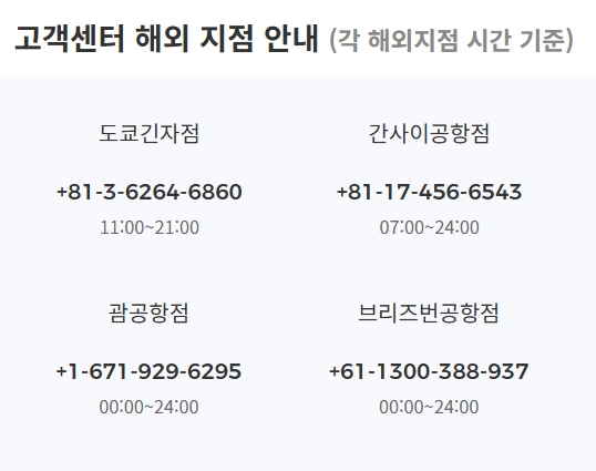고객센터 해외지점 전화번호는 도쿄긴자점 +81-3-6264-6860(11:00~21:00), 간사이공항점 +81-17-456-6543(07:00~24:00), 괌공항점 +1-671-929-6295(00:00~24:00), 브리즈번공항점 +61-1300-388-937(00:00~24:00)입니다.