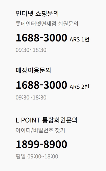 - 인터넷 쇼핑문의(롯데인터넷면세점 회원문의) : 1688-3000(ARS 1번), 09:30~18:30