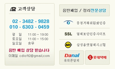 온라인 쇼핑몰 이용시에는 대부분의 재고가 1장이어서 입금기한이 24시간이며, 기한 초과시 주문은 자동취소됩니다. 주문 가능한 모든 음반은 100% 재고를 보유하고 있으며, 음반 제목 앞에 [LP] 라고 적힌 것 외에는 모두 CD입니다.