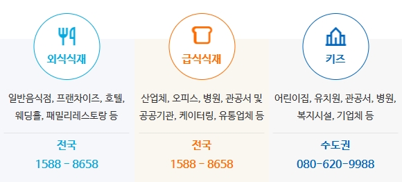 1. 외식식재 (일반음식점, 프랜차이즈, 호텔, 웨딩홀, 패밀리레스토랑 등) : 전국 1588 - 8658번