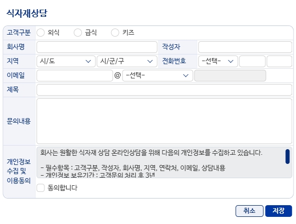 식자재상담 메뉴를 선택하시면 고객구분(외식/급식/키즈), 회사명, 작성자, 지역(시도/시군구), 전화번호, 이메일, 제목, 문의내용을 입력하여 등록할 수 있습니다.