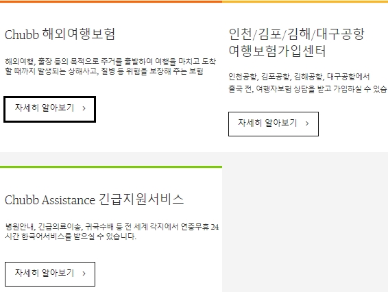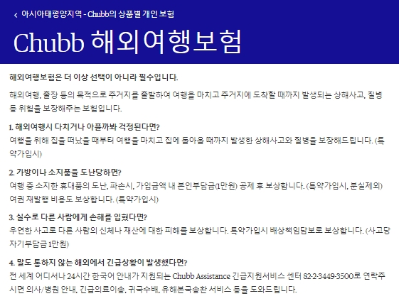 해외여행, 출장 등의 목적으로 주거를 출발하여 여행을 마치고 도착할때까지 발생되는 상해사고, 질병 등 위험을 보장해주는 보험상품입니다. 인천/김포/김해/대구공항 여행보험가입센터와 Chubb Assistance 긴급지원서비스 메뉴도 있으니 같이 참고하시기 바랍니다.