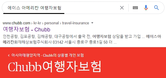 저는 구글검색을 활용해보았습니다. 메인화면에 Chubb 여행자보험이라는 문구가 적혀있고, 그 아래쪽에는 몇 몇 메뉴들이 있습니다.