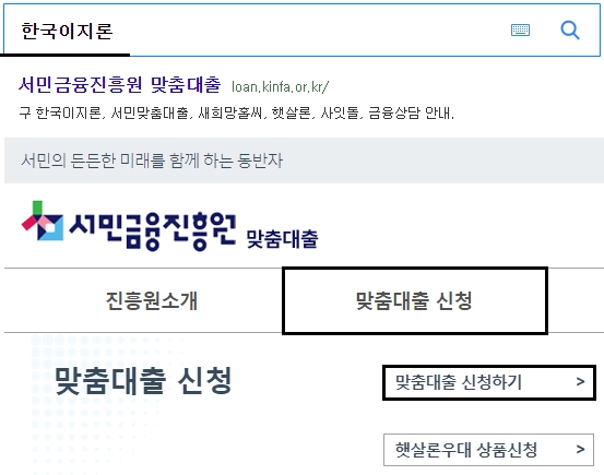 그런데 포털이나 검색엔진 등을 활용하여 한국이지론을 검색하면 서민금융진흥원 맞춤대출 사이트가 뜨는데요, 아마도 명칭이 바뀐 것 같습니다. 서민의 든든한 미래를 함께하는 동반자라는 문구가 적혀있는데요, 메인화면 상단에 있는 [맞춤대출 신청] 메뉴를 선택하여 신청하실 수 있습니다.
