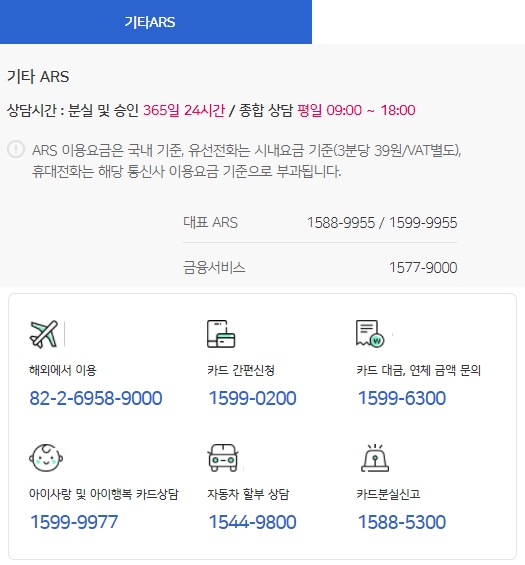 대표번호는 위의 그림과 같습니다. 상담시간은 분실 및 승인의 경우 365일 24시간이고, 종합상담은 평일 09시부터 18시까지 이용할 수 있습니다. ARS 이용시 통화료가 부과되며,