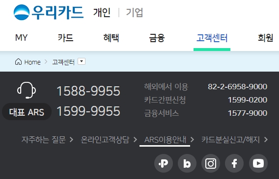 일단은 우리카드 홈페이지 주소를 찾아서 접속해야겠죠? 인터넷검색 또는 웹검색을 활용하여 찾아보시면 바로가기 주소를 통할 수 있으며, 메인화면 상단 우측에 있는 [고객센터] 메뉴를 눌러서 스크롤을 하단까지 내리시면 대표 ARS번호를 확인할 수 있습니다. 더 상세한 정보를 보기위해서는 [ARS이용안내] 항목을 선택합니다.