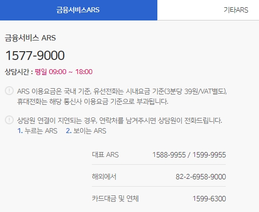 다음은 금융서비스 ARS를 보겠습니다. 상담시간은 평일 09시부터 18시까지이고, 좀전과 마찬가지로 전화이용시 통화료가 부과될 수 있으며 상담원 연결이 지연되면 연락처를 남겨서 회신받으시기 바랍니다. 누르는 ARS 및 보이는 ARS 서비스도 이용할 수 있습니다.