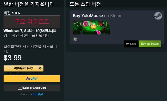 만약 시간제한 없이 사용하시려면 3.99달러를 지불하고 무제한으로 이용할 수 있습니다. 스팀버전도 있는데요, 가격은 4400원이네요.