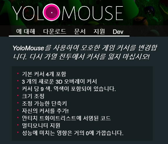 온라인 게임을 하다보면 마우스 커서가 잘 보이지 않을때가 있습니다. 중요한 상황이었다면 게임의 승패나 캐릭터의 운명에 큰 영향을 미칠수도 있는데요, 이번시간에는 그러한 문제를 해결할 수 있도록 마우스 커서 변경 프로그램을 알아보았습니다. 요로마우스 또는 YoloMouse인데요, 포털이나 검색엔진 등을 활용하여 바로가기 링크를 통할 수 있습니다.
