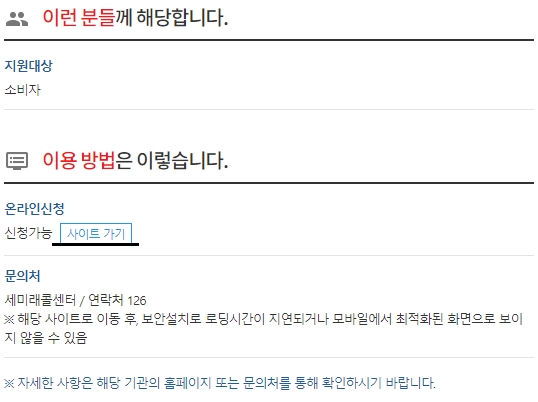 지원대상은 소비자이고, 온라인으로 신청할 수 있습니다. [사이트 가기] 링크를 눌러서 국세청 홈택스 홈페이지에 접속할 수 있어요. 문의처는 세미래콜센터이고 연락처는 126입니다.