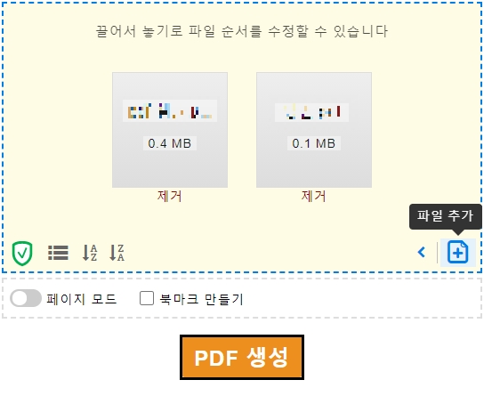 제 컴퓨터에 저장되어 있던 PDF파일들을 추가해보았습니다. 화면 하단 우측에 있는 더하기 모양의 버튼을 눌러서 원하는만큼 계속 추가할 수 있습니다. 저는 총 2개의 파일을 업로드 해보았으며 [PDF 생성] 단추를 눌러서 합치기 작업을 완료할 수 있스빈다.