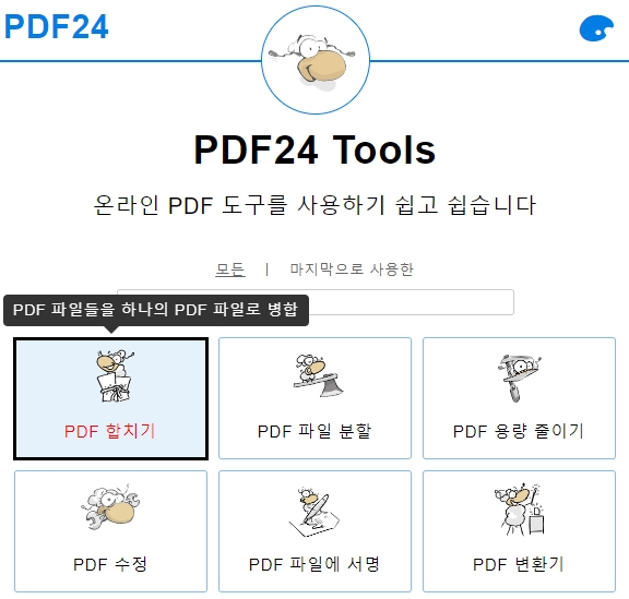 온라인 PDF 도구를 사용하기 쉽게 이용할 수 있다고 하는데요, 메인화면을 보시면 알겠지만 다양한 작업을 제공합니다. 그중에서 [PDF 합치기] 항목을 선택하시면 되는데요, 피디에프 파일들을 하나의 파일로 병합할 수 있습니다.