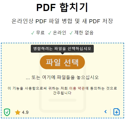 그럼 저도 곧바로 PDF 결합 작업을 진행해보도록 하겠습니다. [파일 선택] 버튼을 눌러서 병합하려는 파일을 추가할 수 있습니다. 또는 직접 드래그하여 옮겨놓을수도 있습니다.