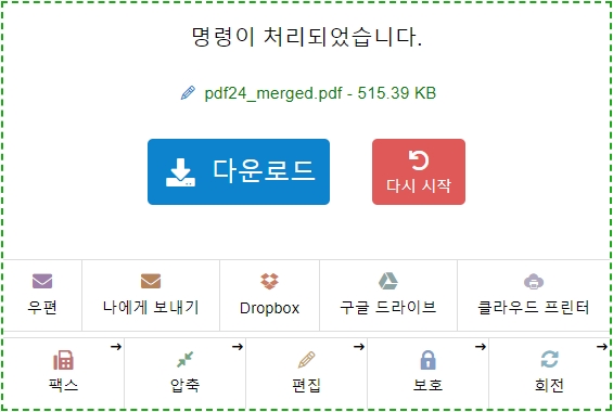파일의 개수나 용량에 따라서 작업시간에 차이가 있을 수 있겠지만, 저는 가벼운 용량의 문서 2개를 합쳐서 그런지 매우 빠르게 작업이 완료되었습니다. 이제 [다운로드] 버튼을 눌러서 PC에 저장할 수 있고 이외에도 우편, 드롭박스, 구글드라이브, 클라우드프린터, 팩스, 압축, 편집, 보호, 회전과 같은 작업을 할 수 있습니다.
