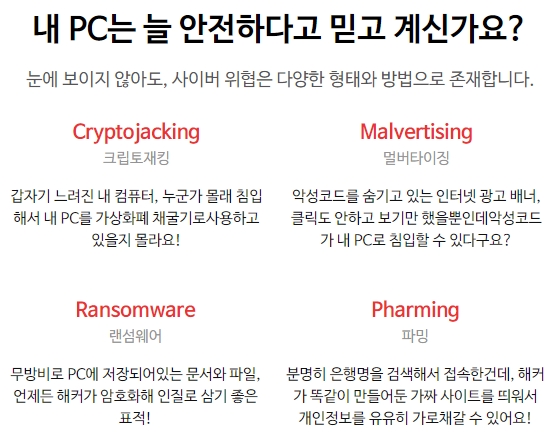 눈에 보이지 않아도 사이버 위협은 다양한 형태와 방법으로 존재한다고 하는데요 크립토재킹, 멀버타이징, 랜섬웨어, 파밍 등이 있습니다. 이중에서 랜섬웨어는 저도 실제로 걸려본적이 있는데, 파일에 암호가 걸려서 열지 못하도록 만들어버리더군요. 그당시에 PC를 아예 포맷을 해버렸는데, 그 이후로는 더 컴퓨터 관리를 잘 해야겠다는 생각을 했습니다.