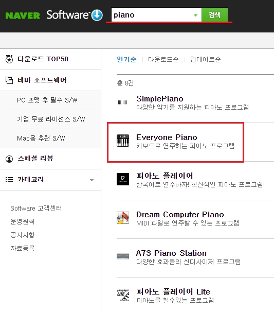 해당 프로그램을 찾기위하여 네이버 자료실을 활용해보았습니다. 통합검색창에다가 위의 그림처럼 [piano] 정도로 키워드를 잡아서 검색하시면 총 8건의 결과를 확인할 수 있는데요, 인기순으로 나열했을때 2위에 있습니다. 1위는 심플피아노인데 아마 아시는 분들도 많을겁니다.