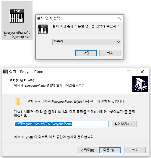 그럼 저도 셋업아이콘을 실행해서 설치를 진행해보겠습니다. 인스톨 과정 중에 사용할 언어를 고를 수 있는데요, 기본적으로 한국어 세팅이 되어있습니다. 어디에 저장할 것인지 위치도 지정할 수 있는데요 [찾아보기] 버튼을 눌러서 원하는 위치로 지정합니다. 이 프로그램은 최소 11.2MB의 디스크 여유공간을 필요로 합니다.