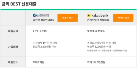 다음으로는 금리가 가장 좋은 상품들을 보겠습니다. 신한은행 쏠편한 직장인대출S의 경우 최저 2.79%부터이며, 카카오뱅크 신용대출의 경우 3.203%부터입니다. 한도는 각각 최대 2억원과 1.5억원입니다. 이 두가지의 상품을 비교하자면 개인적으로는 신한은행의 것이 더 좋아보이네요.