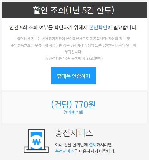 연간 5회 조회여부를 확인하기 위해서는 본인확인이 필요하며, 입력한 정보는 신용평가기관에 본인확인용으로 제공됩니다. 휴대폰 인증을 하고 조회할 수 있는데요, 이용료는 부가세를 포함해서 건당 770원입니다. 여러건을 한꺼번에 결제하시려면 충전서비스를 이용하세요.