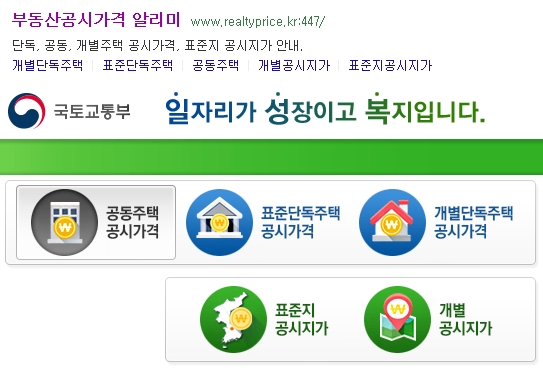 먼저 해당 서비스를 제공하는 사이트 및 홈페이지 주소를 찾아서 접속해보겠습니다. 다음이나 네이버 또는 구글 등을 활용하여 검색하시면 되는데요, 메인화면 상단에 있는 메뉴를 확인합니다. 공동주택, 표준단독주택, 개별단독주택 공시가격과 표준지 및 개별 공시지가를 확인할 수 있어요.