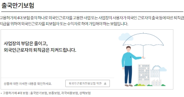 외국인 근로자를 피보험자 또는 수익자로 하여 가입해야 하는 보험입니다. 사업장의 부담을 줄이고 근로자의 퇴직금은 지킬 수 있습니다.