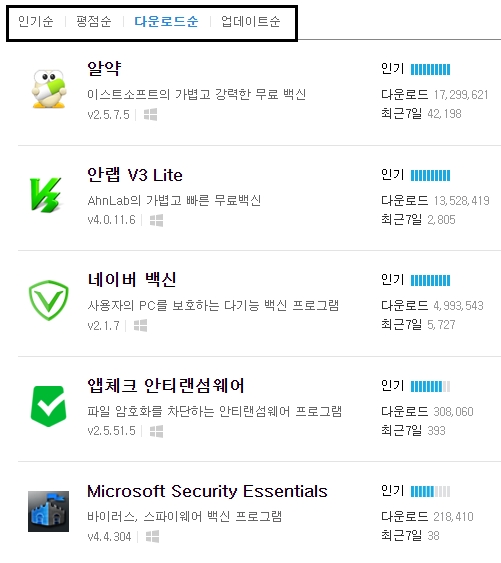 마지막으로는 다운로드순을 보겠습니다. 사람들이 얼마나 제품을 신뢰하고 많이 다운받았는지를 보여주기때문에 신뢰도가 크다고 할 수 있습니다. 1등부터 5등까지 알약, 안랩, 네이버백신, 앱체크 안티랜섬웨어, Microsoft Security Essentials가 차지했습니다.