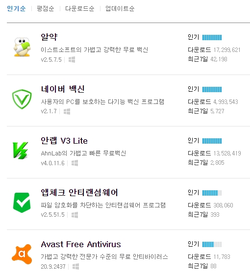 먼저 인기순으로 보겠습니다. 1위는 알약, 2위는 네이버 백신, 3위는 안랩 V3 Lite, 4위는 앱체크 안티랜섬웨어, 5위는 Avast Free Antivirus가 차지했습니다.
