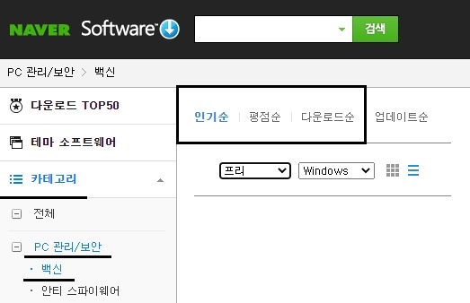 NAVER Software 홈페이지의 모습은 위의 그림과 같습니다. 카테고리에서 [PC관리/보안] 메뉴의 [백신] 항목을 선택했습니다. 지원하는 OS는 윈도우 그리고 사용범위는 프리웨어를 기준으로 잡았습니다. 인기순, 평점순, 다운로드순별로 순위가 어떻게 되는지 알아볼게요. 업데이트순은 크게 의미가 없을 것 같아서 배제했습니다.