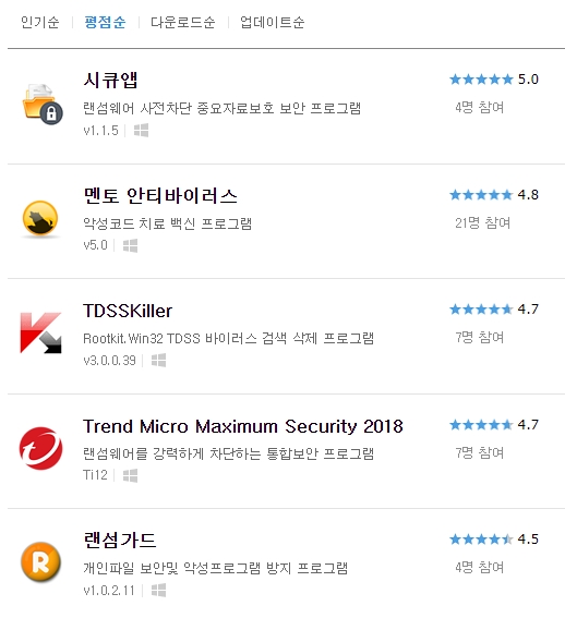 다음으로는 평점순으로 정렬해보겠습니다. 1위부터 5위까지 각각 시큐앱, 멘토 안티바이러스, TDSSKiller, Trend Micro Maximum Security 2018, 랜섬가드입니다. 처음보는 프로그램들이 올라와 있는데 사실 평점순의 기준에는 평가에 참여한 사람의 수는 고려되지 않기때문에 신뢰도가 그렇게 높은편은 아닙니다.