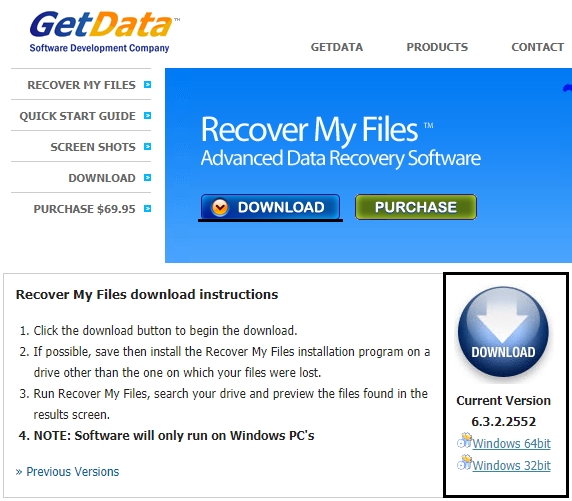 GetData 홈페이지에 접속하시면 Recover My Files라는 파일복구 프로그램을 다운받을 수 있습니다. 파티션이 손상, 포맷, 파일삭제, 휴지통 비움, 바이러스 등의 원인으로 인하여 파일이 삭제된 경우 간편하게 복구하게 해줄 수 있는 소프트웨어입니다. 다운로드 후 검색 가능하며, 기능은 정식버전과 동일합니다. 검색 후 복구율에 만족하시면 라이센스 구매 후 복구작업을 진행할 수 있습니다.
