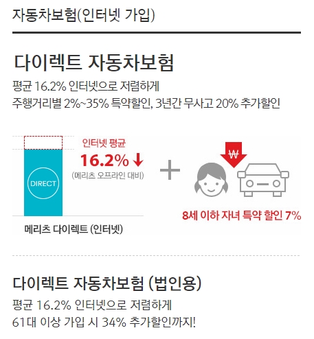 메리츠 다이렉트 자동차보험은 크게 두가지 상품을 제공하고 있는데요, 각각은 인터넷 가입용과 법인용입니다. 상세페이지로 들어가면 특약과 할인내용을 확인할 수 있어요.