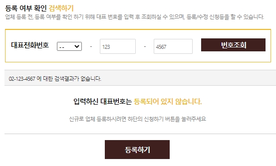 그럼 저도 임의로 번호를 입력하여 등록 여부 확인을 해보겠습니다. 업체 등록 전, 등록 여부를 확인하기 위하여 대표번호를 입력 후 조회할 수 있으며 등록/수정 신청을 할 수 있습니다. 제가 입력한 번호는 아직 등록되어있지 않기때문에 신규로 업체등록을 할 수 있겠네요.