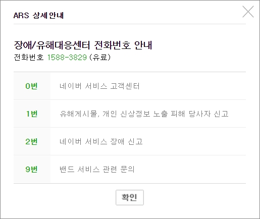 장애 및 유해대응센터 전화번호 안내를 클릭하시면 ARS 상세안내를 확인할 수 있습니다. 0번은 네이버 서비스 고객센터이고, 1번은 유해게시물 및 개인 신상정보 노출 피해 당사자 신고, 2번은 네이버 서비스 장애 신고, 9번은 밴드 서비스 관련 문의입니다.