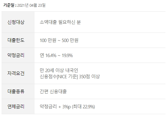신청대상은 소액대출이 필요한 고객이고, 한도는 최저 100만원부터 최고 500만원까지입니다. 약정금리는 연 16.4%부터 19.9%까지이고, 자격요건은 만 20세 이상의 내국인으로 신용점수가 나이스기준 350점 이상이어야 합니다. 간편 신용대출 상품이며, 연체금리는 약정금리에 추가로 3%까지 붙을 수 있습니다. 최대 22.9%를 초과하지는 않는다고 하네요.