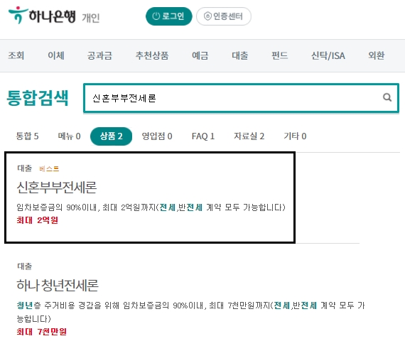 하나은행 홈페이지 주소를 찾아서 접속하시면, 통합검색을 활용하여 원하는 상품을 찾을 수 있습니다. 위의 그림처럼 키워드를 잡아주시면 되는데요, 신혼부부전세론과 청년전세론이 나왔네요.
