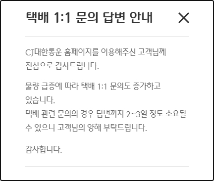 최근 물량 급증에 따라서 택배 일대일 문의가 증가하고 있다고 하는데요, 택배 관련 문의의 경우 답변까지 2~3일 정도가 소요될 수 있다고 합니다.