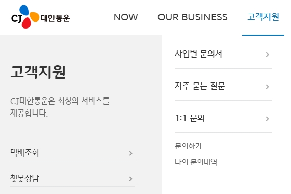 어쨌든 CJ 대한통운 홈페이지 주소를 찾아서 접속해보도록 하겠습니다. 메인화면 상단 우측에 있는 [고객지원] 메뉴를 선택하여 택배조회 및 챗봇상담을 할 수 있습니다. 또한 사업별 문의처, 자주 묻는 질문, 1:1 문의도 이용할 수 있으니 참고하시기 바랍니다.