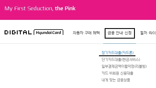 먼저 현대카드 홈페이지 주소를 찾아서 접속해볼게요. 웹이나 인터넷검색 등을 활용하여 사이트 바로가기를 통할 수 있으며, 메인화면 상단에 있는 [금융 안내/신청] 메뉴를 선택하고