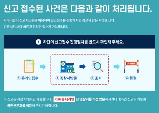 신고는 피해자 본인만 가능하며, 가족이나 대리인은 경찰서를 직접 방문하거나 대리인 신고가 가능한 국민신문고를 이용할 수 있습니다. 발견한 사이버범죄의 경우 [제보하기]를 이용해주세요.