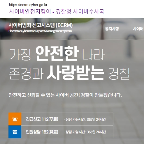 혹시라도 피해를 당했다면 경찰청 사이버안전지킴이 사이트에 접속하여 신고할 수 있습니다. 사이트 주소는 위의 그림과 같으며, 메인화면에서 긴급신고 및 민원상담 전화번호를 확인할 수 있습니다. 상담이 가능한 시간은 365일 24시간이며, 긴급신고는 무료이고 민원상담은 유료입니다.