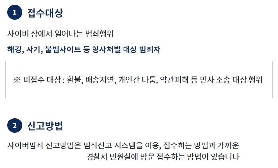 접수대상은 사이버상에서 일어나는 범죄행위로 해킹, 사기, 불법사이트 등 형사처벌 대상 범죄자입니다. 비접수대상은 환불, 배송지연, 개인간 다툼, 약관피해 등 민사 소송 대상 행위입니다. 사이버범죄 신고방법은 범죄신고 시스템을 이용하여 접수하는 방법과, 가까운 경찰서 민원실에 방문접수하는 방법이 있습니다.