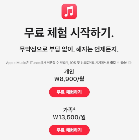 무료체험을 하시면 무약정으로 부담없이 이용할 수 있으며, 언제든지 해지할 수 있습니다. 계속해서 서비스를 이용하시려면 비용을 지불해야 하는데요, 애플뮤직 가격은 위의 내용과 같습니다. 개인은 월 8900원이고, 가족은 월 13500원입니다.